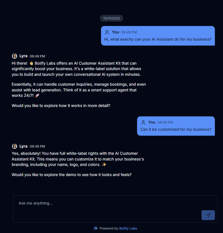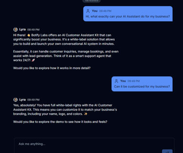 Ask Lyra: Our live AI assistant built from this kit. Ask her anything.